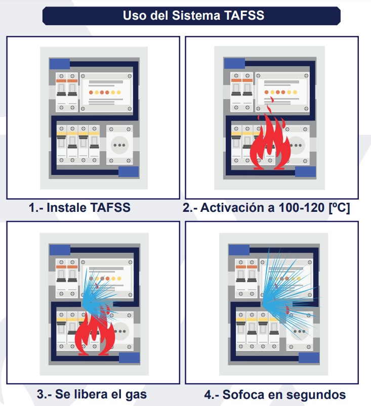 - El Sistema TAFFSS Se activa automáticamente cuando la temperatura alcanza un rango específico, entre 100 y 120 grados Celsius, en espacios cerrados. Esta característica permite una respuesta rápida y efectiva ante la detección de un incendio incipiente.